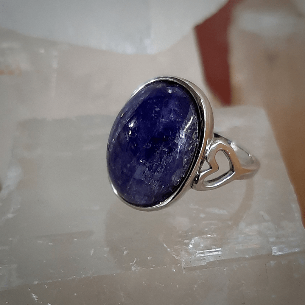 This oval Tanzanite gemstone is set in a sterling silver rim with an embellished Celtic heart knot band to remind the wearer with the infinite possibilities and qualities of eternal love energy. It’s feminine energies are complimented with the properties of compassionate communication with self and others in truth and kindness. This ring is balanced with the properties of Tanzanite and united with the infinite Celtic energies of the goddess. Measuring 1.5 cm wide x 1.9 cm.